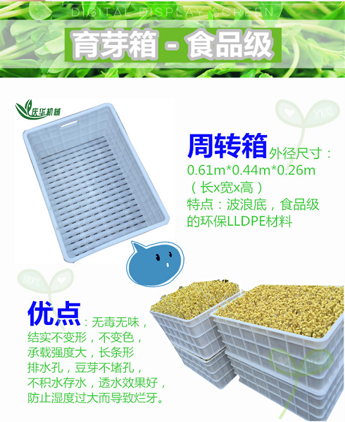 6、豆芽機(jī)結(jié)構(gòu)特點(diǎn)及功能(可根據(jù)客戶需要訂做): 4)周轉(zhuǎn)箱的外徑尺寸:0.61m*0.44m*0.26m(長(zhǎng)寬高),特點(diǎn):波浪底,食品級(jí)的環(huán)保LLDPE材料,無(wú)味,結(jié)實(shí)不變形,不變色,承載強(qiáng)度大,長(zhǎng)條形排水孔,豆芽不堵孔,不積水存水,透水效果好,防止?jié)穸冗^(guò)大而導(dǎo)致?tīng)€牙。