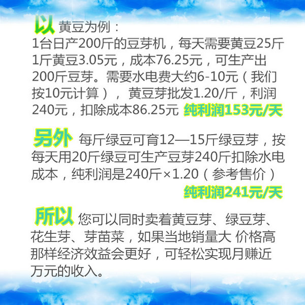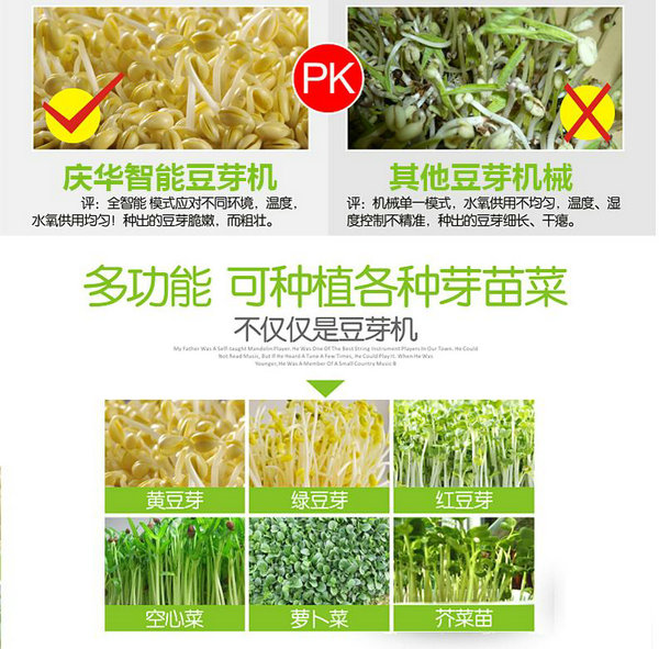 5、豆芽機(jī)產(chǎn)品特點(diǎn): 5)減少爛芽現(xiàn)象。豆芽生長(zhǎng)的爛芽現(xiàn)象多發(fā)生在培育后的三天左右,由于手工生產(chǎn)豆芽的周期長(zhǎng),易出現(xiàn)爛芽現(xiàn)象,然而采用豆芽機(jī)生產(chǎn),三天左右豆芽已經(jīng)成熟,可以采收食用,不會(huì)有爛芽現(xiàn)象發(fā)生。