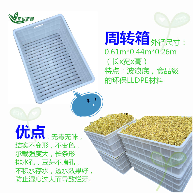 5)減少爛芽現(xiàn)象。豆芽生長(zhǎng)的爛芽現(xiàn)象多發(fā)生在培育后的三天左右,由于手工生產(chǎn)豆芽的周期長(zhǎng),易出現(xiàn)爛芽現(xiàn)象,然而采用豆芽機(jī)生產(chǎn),三天左右豆芽已經(jīng)成熟,可以采收食用,不會(huì)有爛芽現(xiàn)象發(fā)生。 6、豆芽機(jī)結(jié)構(gòu)特點(diǎn)及功能(可根據(jù)客戶需要訂做): 4)周轉(zhuǎn)箱的外徑尺寸:0.61m*0.44m*0.26m(長(zhǎng)寬高),特點(diǎn):波浪底,食品級(jí)的環(huán)保LLDPE材料,無味,結(jié)實(shí)不變形,不變色,承載強(qiáng)度大,長(zhǎng)條形排水孔,豆芽不堵孔,不積水存水,透水效果好,防止?jié)穸冗^大而導(dǎo)致爛牙。 7、價(jià)格:價(jià)格即可購(gòu)得