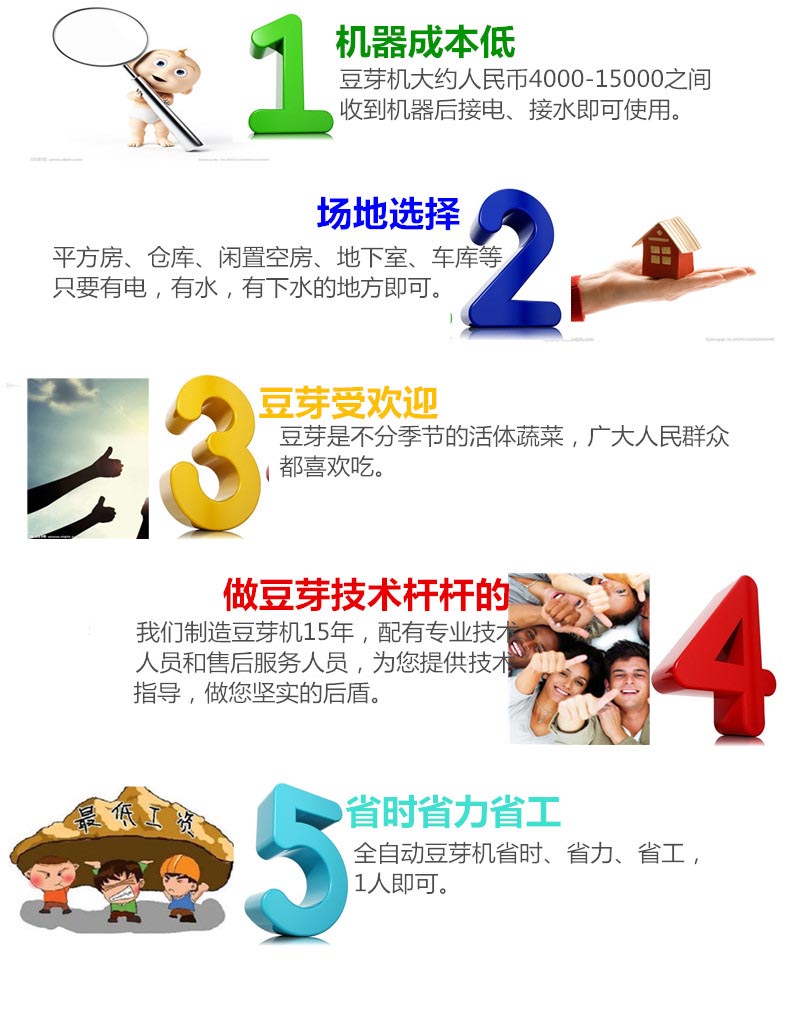 對來本廠購機的客戶,我們專車到車站接送,并報銷一部分來回火車票、汽車票,在本工廠參觀學(xué)習(xí)期間,免費提供食宿,我們以“我誠信、你放心”經(jīng)營理念與客戶建立和諧的、共發(fā)展共榮辱的合作關(guān)系,讓我們的產(chǎn)品去說話! 我工廠內(nèi)擁有大型豆芽生產(chǎn)車間,常年生產(chǎn)豆芽和特色芽苗菜,每天出產(chǎn)豆芽4000斤以上,銷往青州孟七農(nóng)貿(mào)市場和各大及學(xué)校食堂,歡迎各界朋友來我處參觀考察,將現(xiàn)場試機和免費培訓(xùn)生產(chǎn)技術(shù)。 工廠內(nèi)大型培育基地,免費培訓(xùn)30多種芽苗菜生產(chǎn)技術(shù)!